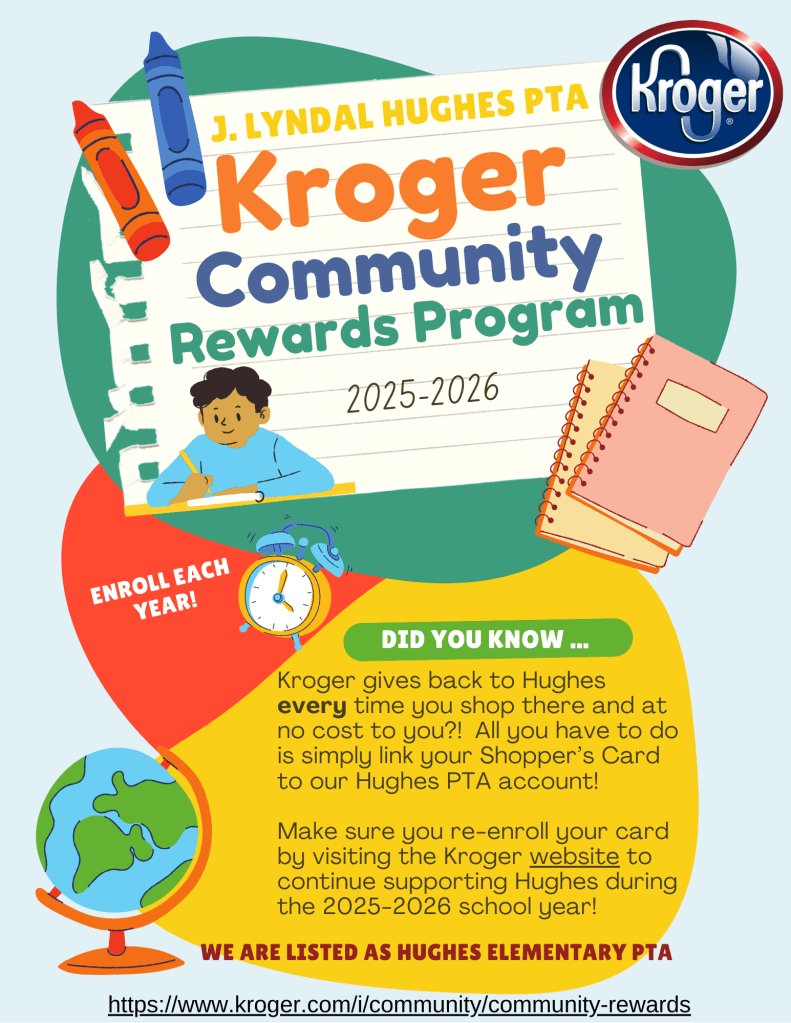 If you have the Kroger app -sign in and go to the Rewards section under My Info. Next, select Community Rewards to search for an organization. We are listed as Hughes Elementary PTA.